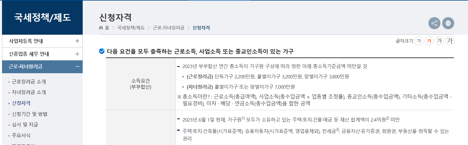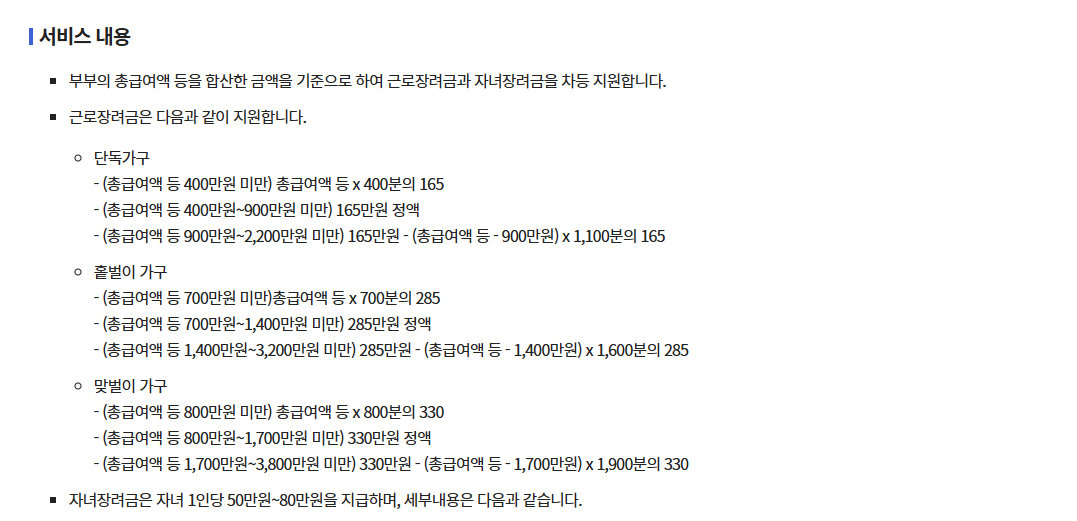 근로장려금 신청자격은 소득이 일정 기준 이하인 가구에 대해 세금 환급 형태로 지급되며, 가구 구성과 소득 수준에 따라 지급액이 달라집니다.