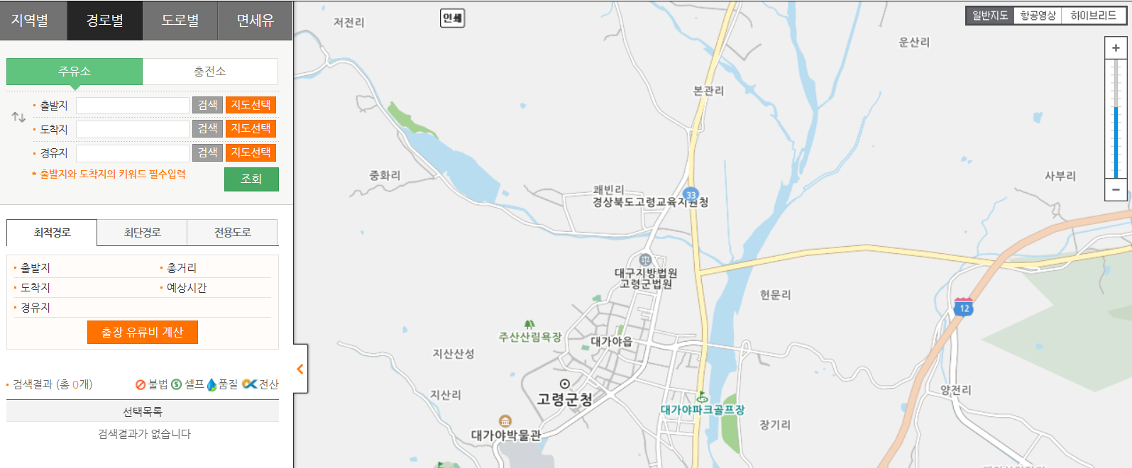 지역을 선택하고 연료 종류를 입력하면 최저가 주유소를 확인할 수 있습니다.