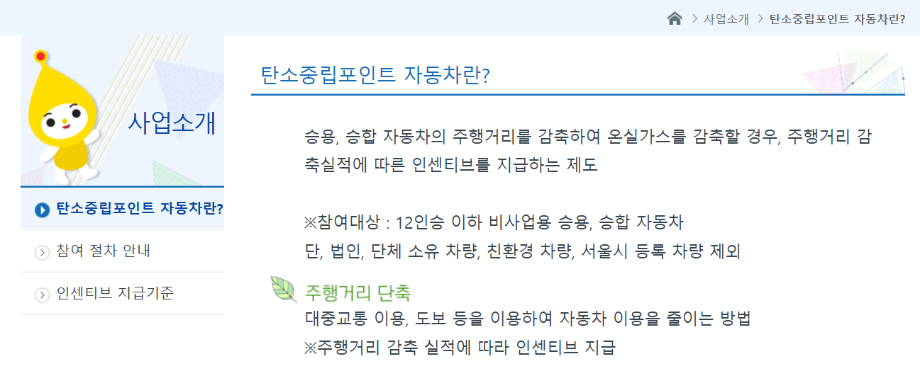 이 제도는 차량 운행거리를 줄이거나 대중교통, 자전거, 도보 이용을 장려하여 온실가스 배출을 줄이기 위한 목적을 가지고 있습니다. 실천의 결과가 데이터로 측정되어 보상으로 제공됩니다.