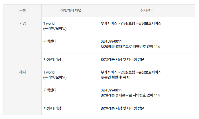 - 온라인: T world > 부가서비스 > 안심/보험 > 유심보호서비스