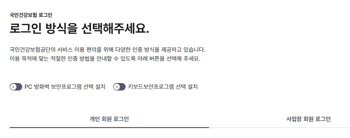 공동인증서(구 공인인증서), 간편인증(카카오, PASS, 삼성페이 등)을 이용하여 본인 인증 후 로그인합니다.