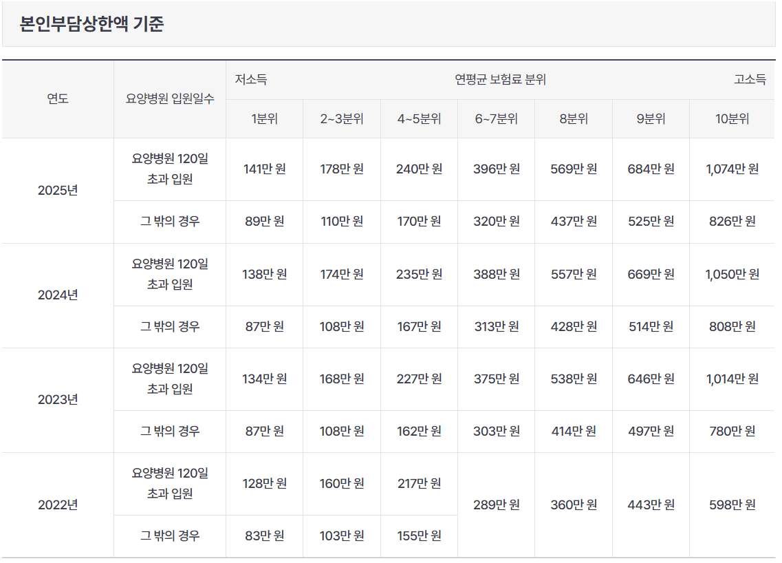 2025년 기준으로 소득 분위별 본인부담 상한액은 소득 기준 및 상한액은 매년 정부 정책에 따라 변경될 수 있으므로 최신 정보를 확인하시기 바랍니다.
