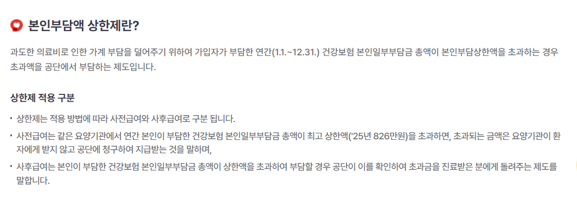 본인부담 상한제는 국민건강 가입자가 일정 금액 이상의 의료비를 본인이 부담하지 않도록 하는 제도입니다. 매년 소득에 따라 설정된 본인부담 상한액을 초과하는 금액은 건강보공단에서 환급해줍니다. 이를 통해 과도한 의료비 지출로 인한 경제적 부담을 줄이고, 국민 건강을 지킬 수 있는 사회 안전망 역할을 합니다.